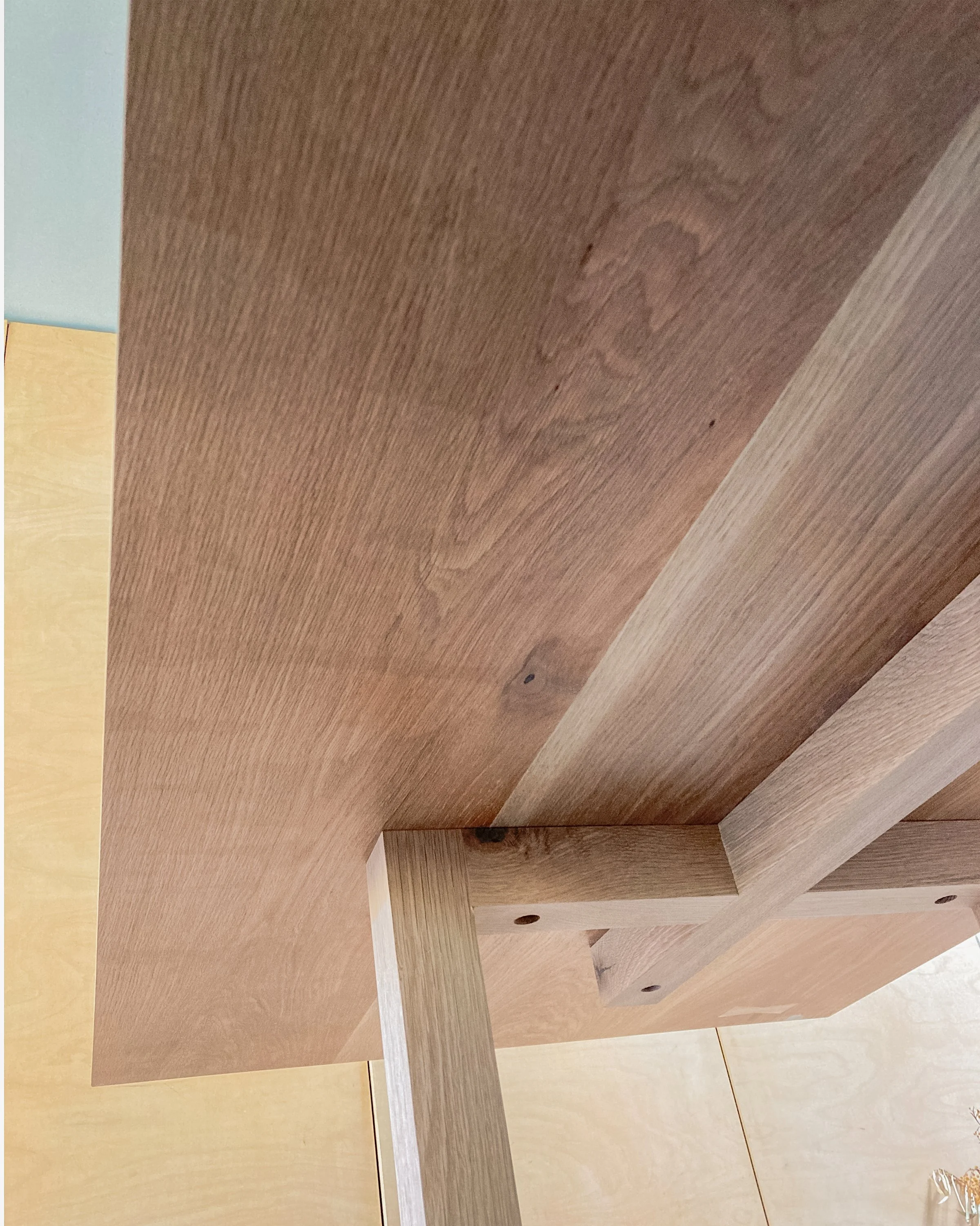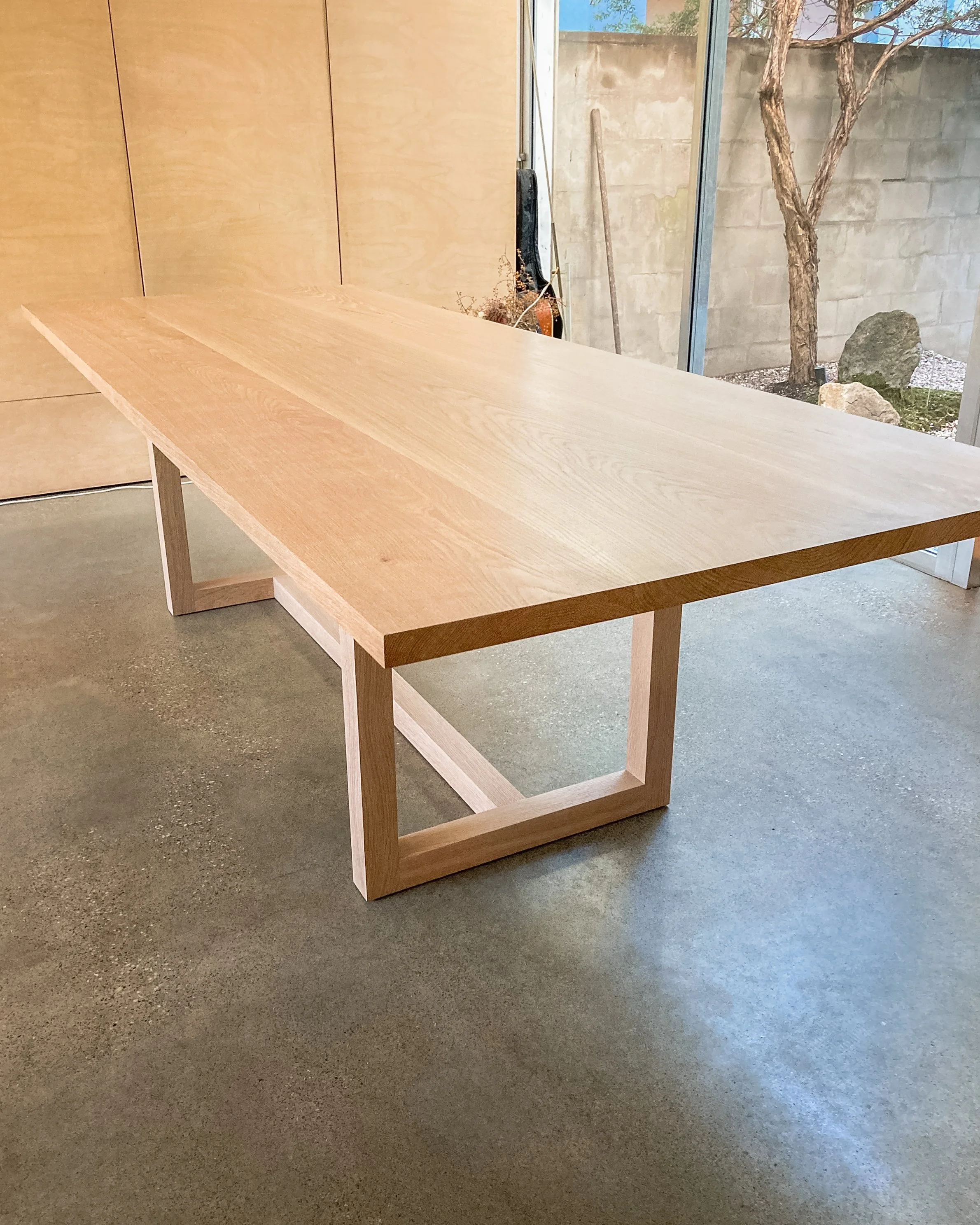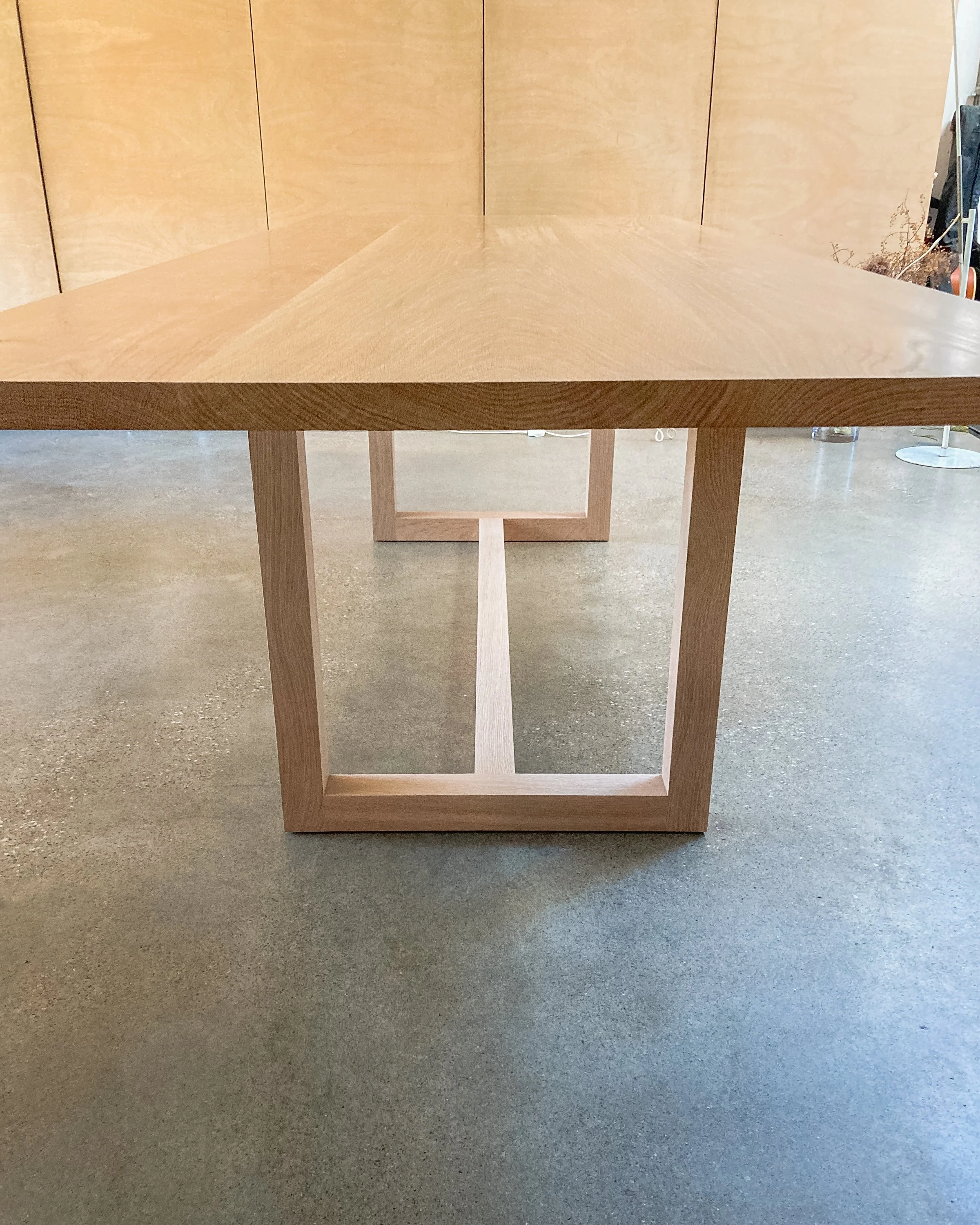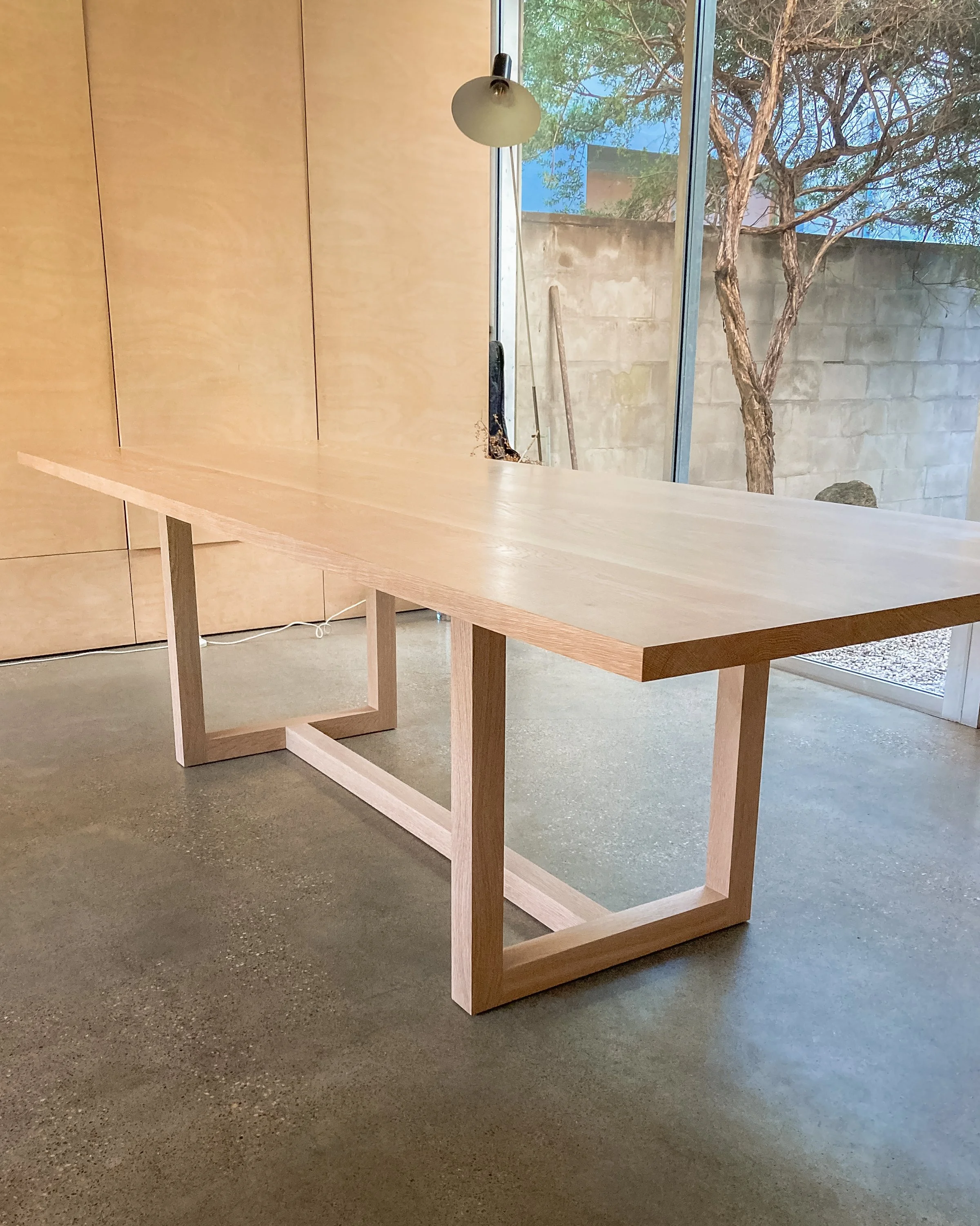 3 massive American Oak planks make up the top of this dining table in Bronte. The finish is deliberately light and not bullet-proof. Over the years glass rings, fork stabs and knife drops will tell a story of its central role in the home.